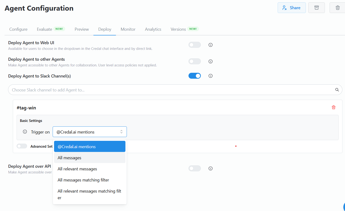 If multiple agents are deployed to a single channel, Credal uses their Descriptions to determine which should respond.
