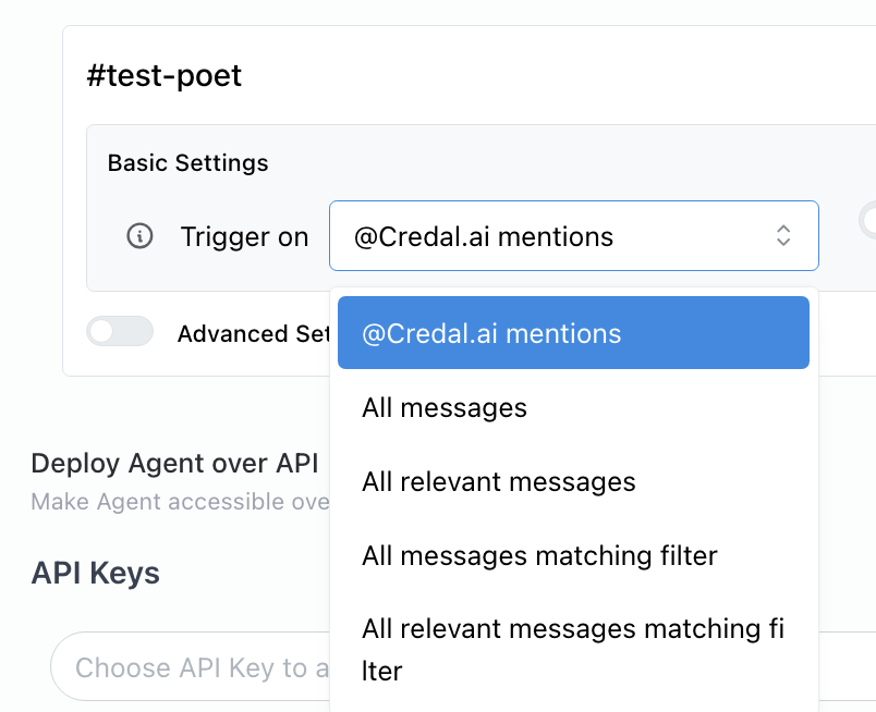 Respond to relevant messages - Credal will look at all of the agents in a Slack channel with this setting and choose which one makes the most sense to respond as based on the user query.