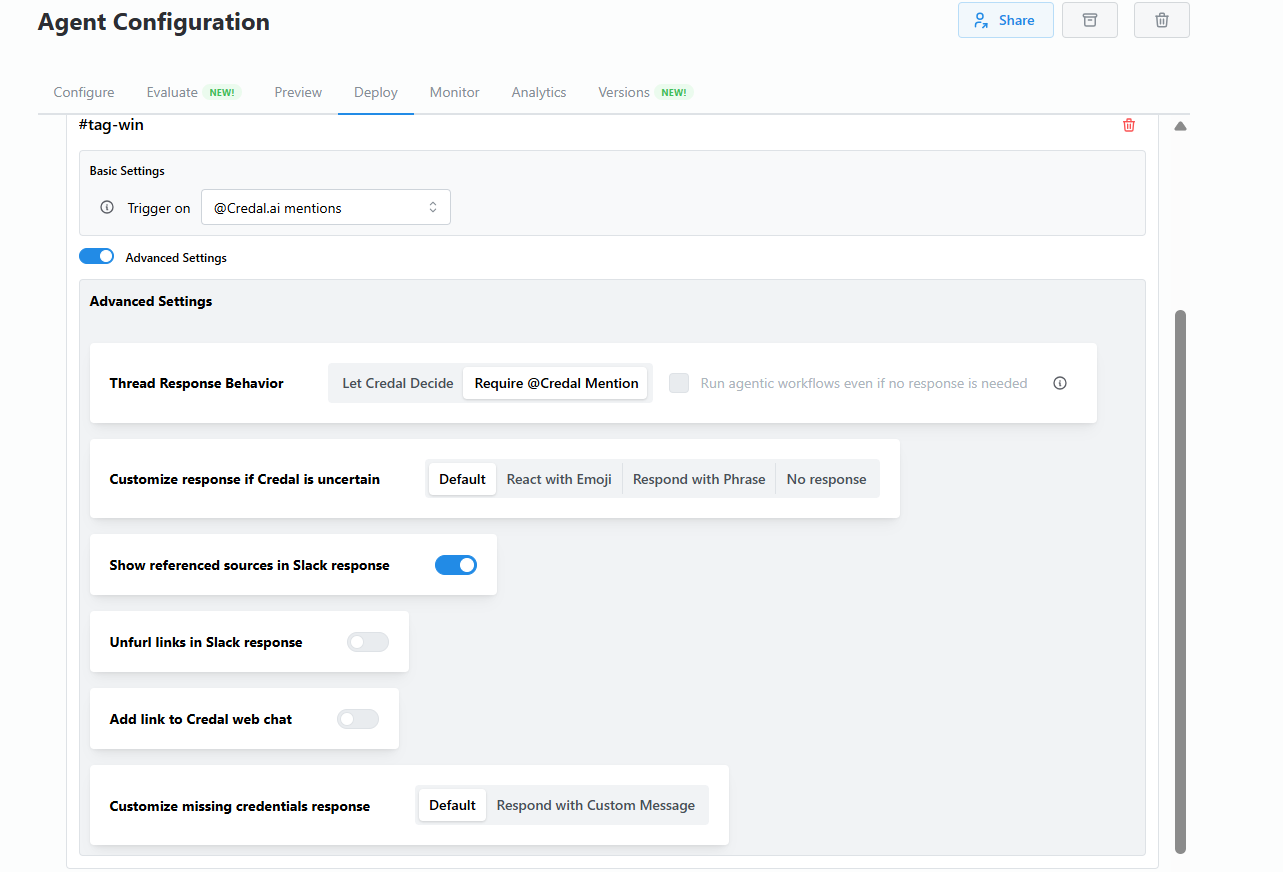Respond when a bot is tagged - The agent only helps when you specifically mention its bot (@Credal.ai or @CustomBotName). This is the Credal bot by default. If multiple agents have this setting, the agent configured first will respond.