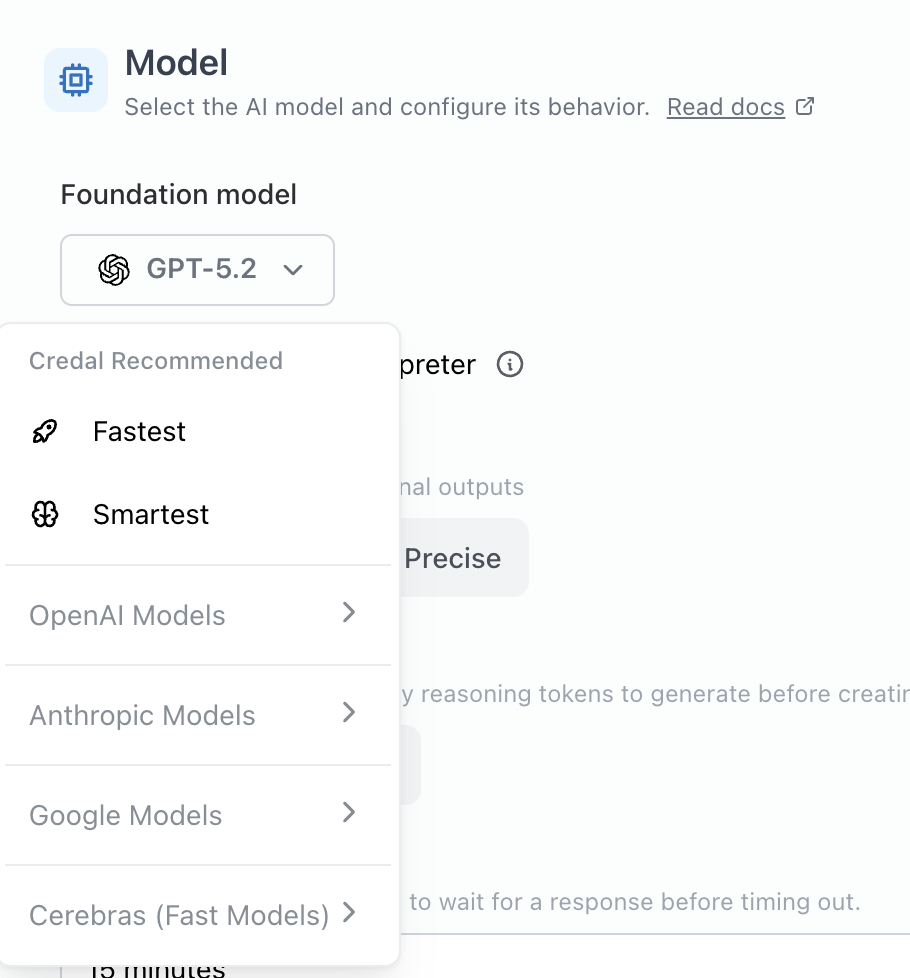 - Model – Choose from the latest models across OpenAI, Anthropic, Google, and Cerebras. Cerebras is worth trying if speed is a priority — it runs open-source models on specialized hardware for significantly faster responses. If you’re unsure, the default is a solid starting point.