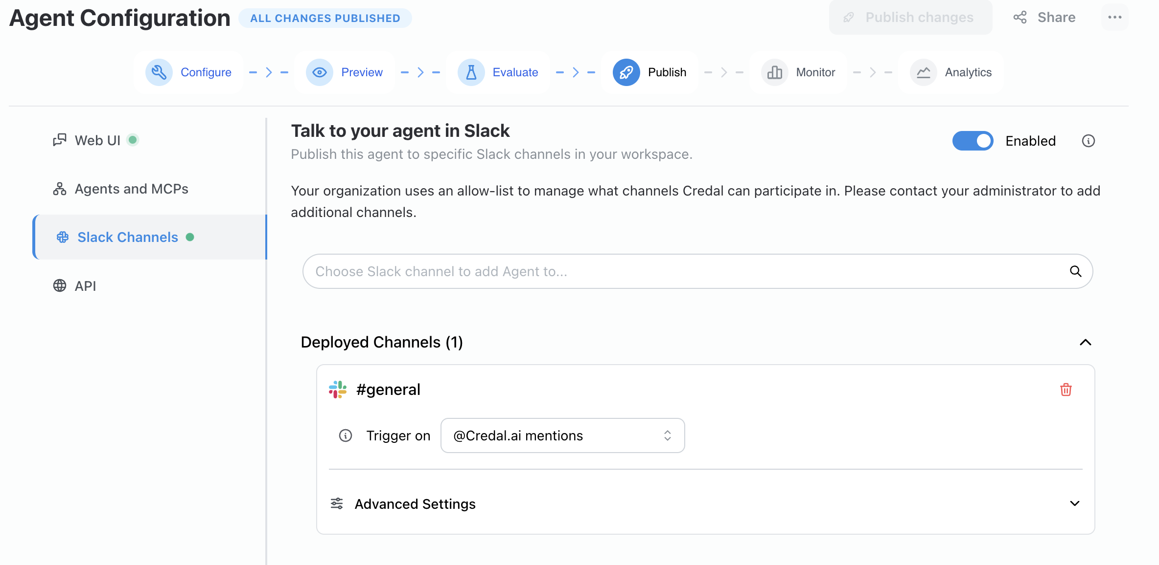 After setup, you can use your agent directly in Credal or publish it to Slack (or other tools via API). This guide covers Slack. For other integrations, see the full documentation.