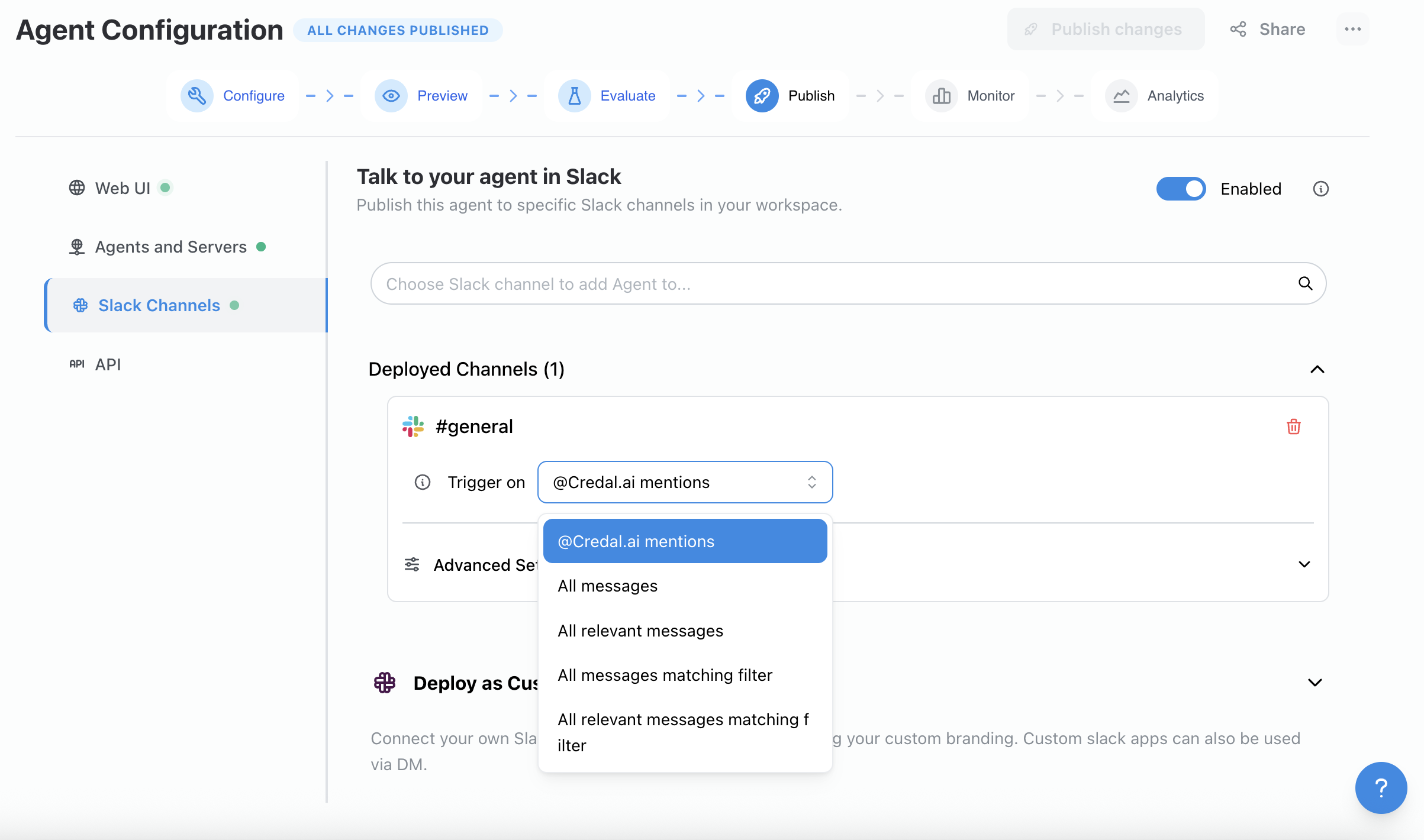 Go to “Slack Channels” in your agents “Publish” settings and enable the ability to talk to your agent in Slack. Then you can select target channels: