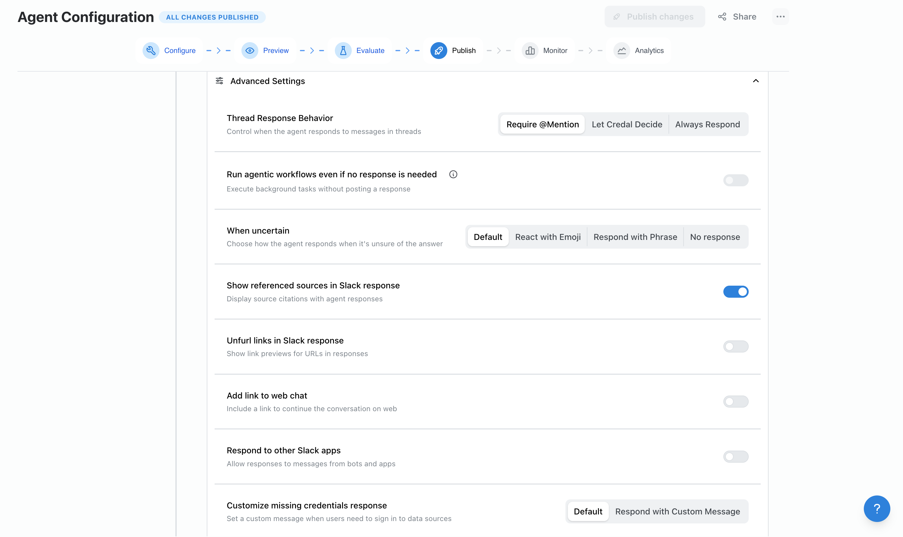 Show referenced sources in Slack response – Toggle to display source links in agent replies.