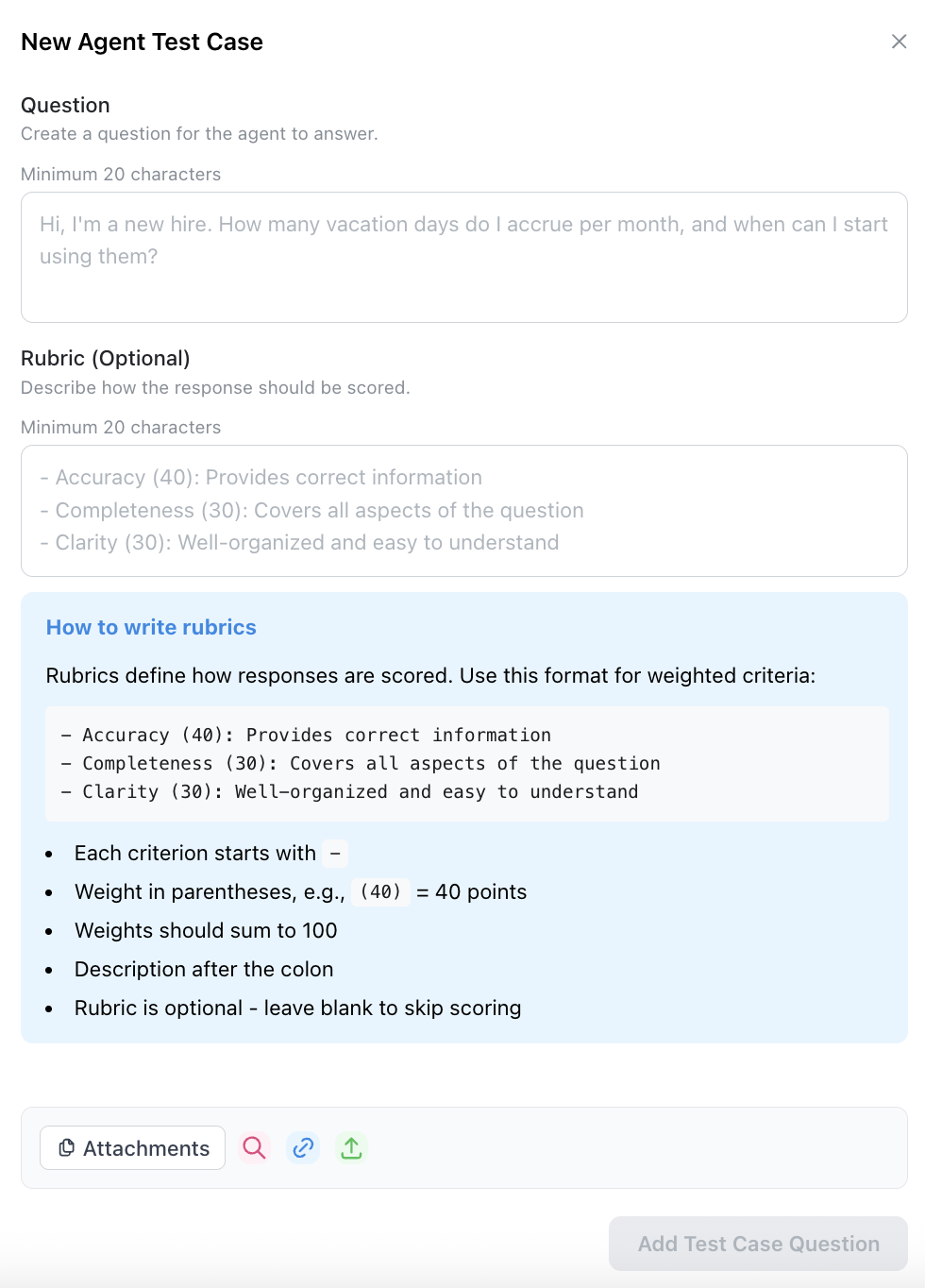 For each test question, you can define a custom rubric that specifies what makes a good answer. Rubrics allow you to: