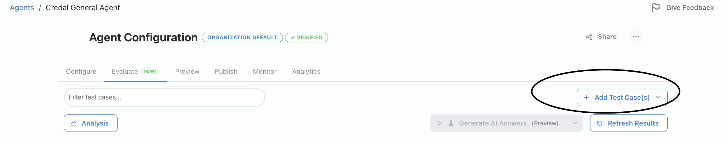 Use the “Add Test Case(s)” button to create test questions. You can optionally provide expected answers for reference, though these are not required for evaluation.
